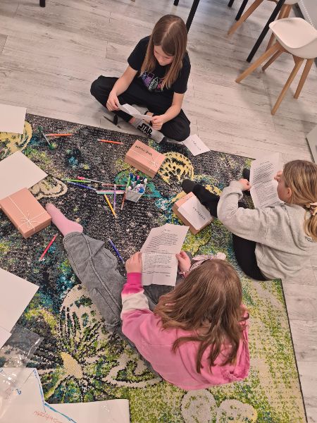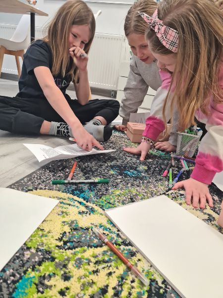 Nasze spotkania mają różne formy, bo wiemy, że każde dziecko rozwija się inaczej i ma inne potrzeby. Czasem bawimy się w gry i zabawy, które nie tylko wywołują uśmiech, ale też uczą współpracy i pomagają odreagować napięcia. Innym razem malujemy, tworzymy muzykę czy tańczymy. Dzięki temu dzieci mogą wyrazić siebie, rozładować emocje i poczuć radość płynącą z ruchu. Zdarza się, że wchodzimy w różne role i odgrywamy scenki, co pozwala ćwiczyć komunikację i empatię. Wspólnie wyruszamy też na małe wyprawy… Do parku, teatru, a czasem w miejsca, które stają się dla dzieci inspiracją do rozmów i twórczych działań. Podczas zajęć uczymy rozwiązywania konfliktów, mówienia o swoich potrzebach, dbania o siebie w codziennych sytuacjach i radzenia sobie z emocjami. Rozwijamy pewność siebie, poczucie własnej wartości i umiejętność budowania zdrowych relacji. Czerpiemy też inspirację z naszych kursów rozwijających kluczowe kompetencje i wykorzystujemy ich elementy w zajęciach – tak, aby dzieci dodatkowo zdobywały umiejętności, które są przydatne w szkole.